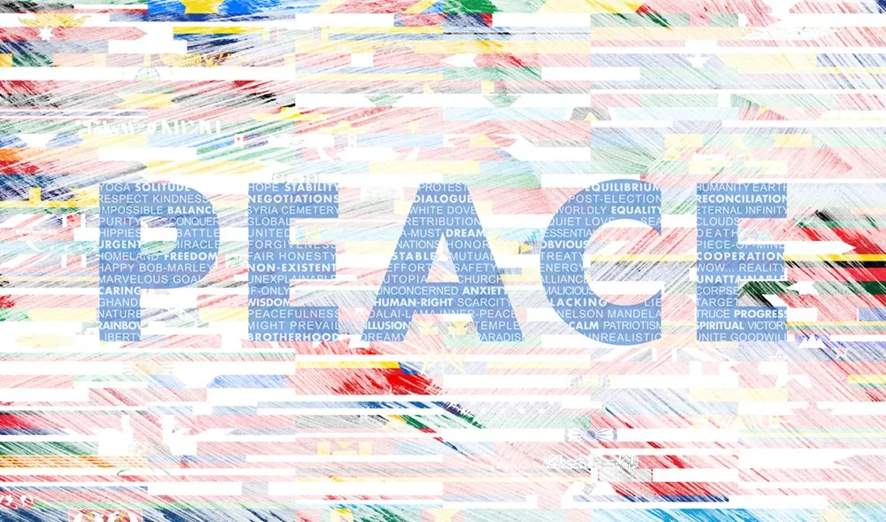The Whitewash series of 13 prints are unique individual collages of one inch strips from the 131 national flags used to represent the more than 3000 participants in the WORDS project. A cross-section of the participants’ answers are embedded in each of the 13 words used for the project.
